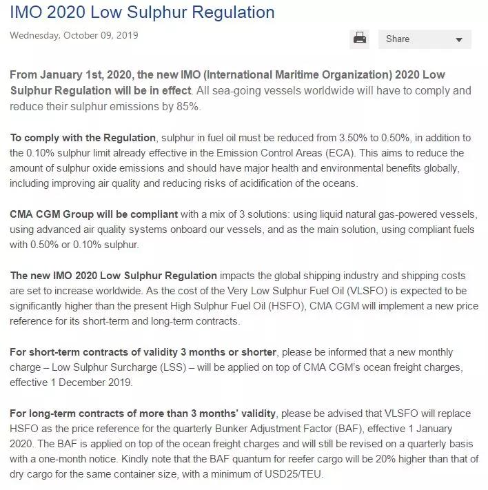 盡管,目前行業(yè)爭(zhēng)議很大。但IMO已反復(fù)明確,該限硫令將不會(huì)有推遲,將準(zhǔn)時(shí)于2020年1月1日起執(zhí)行!而這一新規(guī)也將對(duì)船公司以及貨主、貨代們帶來重要影響!國(guó)外權(quán)威媒體指出,屆時(shí)海運(yùn)費(fèi)將上漲20%左右!因此,請(qǐng)大家務(wù)必注意!