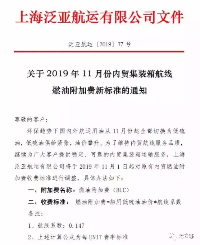 10月8日,上海泛亞航運(yùn)有限公司(以下簡(jiǎn)稱“泛亞航運(yùn)”)發(fā)布通知稱,將嚴(yán)格按照國(guó)家相關(guān)規(guī)定,從2019年11月1日起,對(duì)原有內(nèi)貿(mào)燃油附加費(fèi)收費(fèi)標(biāo)準(zhǔn)進(jìn)行調(diào)整。